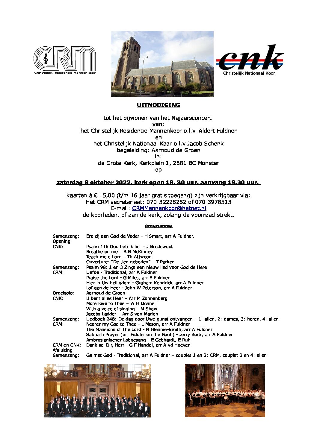 Op zaterdag 8 oktober geven het Christelijk Residentie Mannenkoor en het Christelijk Nationaal Koor een koorconcert in de Grote Kerk te Monster.